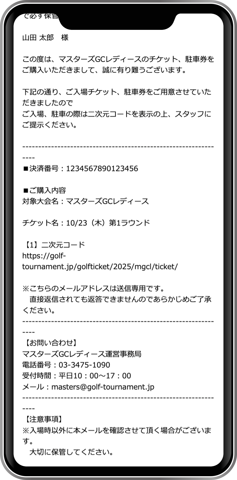 ご入力いただいたメールアドレス宛に、チケット・駐車券が送付されます。URLを開くと、二次元バーコードが表示されます。